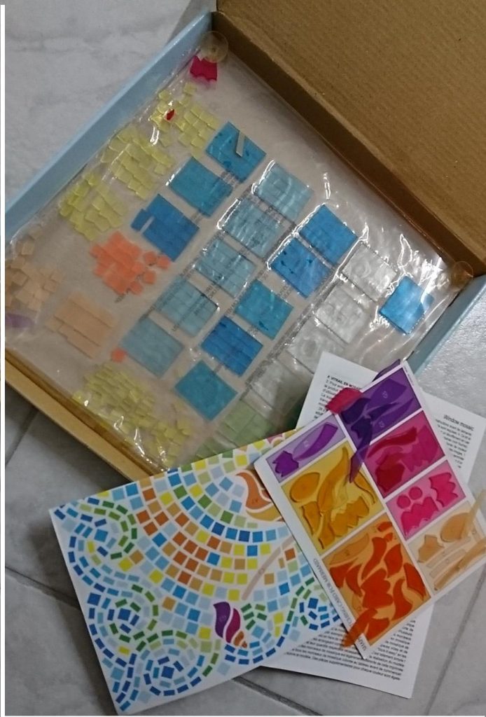 Die passenden Mosaiksteinchen werden alle ungebrochen in quadratischer Form ca. 5×5 mm mitgeliefert. Das heißt, man muss die Steine selbst zurechtschneiden, um Kurven und Formen zu legen und die Leerräume auszufüllen. Das geht mit einer geeigneten Zange kinderleicht. Bei den ersten Versuchen sind noch ein paar Steinchen vom Tisch gesprungen, dann hatte ich die Zange im Griff. Dafür sind genug Ersatzsteine in allen Farben dabei, nur die goldfarbenen Steinchen waren genau abgezählt. Das Prinzip ist einfach und schnell erklärt: die farbige Vorlage wird befeuchtet (z.B. mit einem Pinsel, in dem Bereich an dem man arbeiten will), der Stein wird aufgesetzt und klebt fest. Kleinere Steine bricht man vorher passend durch und hilft sich mit einer Pinzette. Zum Schluss kann man das Kunstwerk verfugen (Fugenmasse ist auch dabei). Ich fand es optisch eigentlich nicht nötig, dachte aber daran, dass die Steine dann besser zusammenhalten.