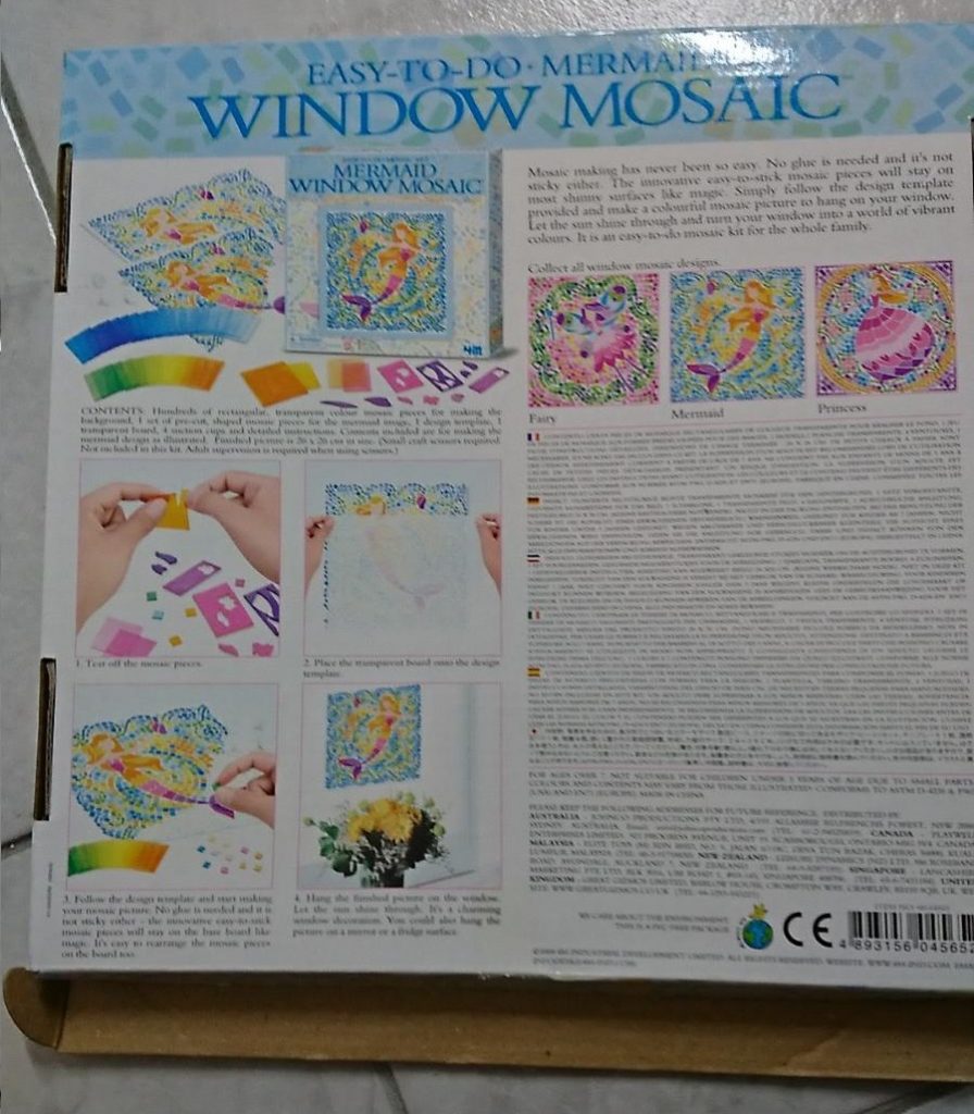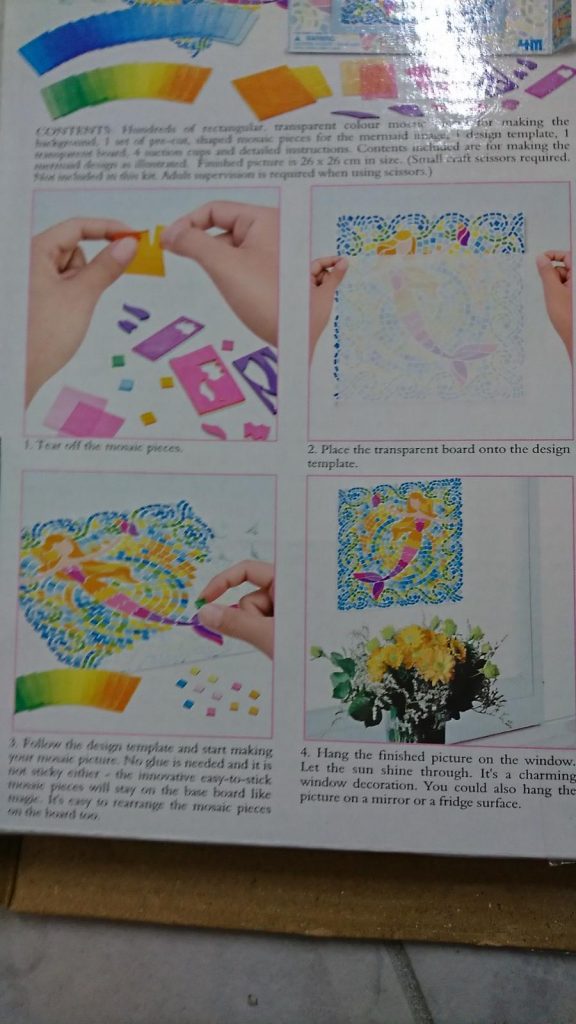 Die Kids bekamen ein Meerjungfrauen-Fensterbild aus vorgestanzten Gel-Teilen. Funktioniert sehr gut – die Teile lassen sich einfach lösen, sind exakt geschnitten und halten auf der Vorlage. Eine sehr schöne Alternative zum Puzzeln – und Fensterbilder finden im Gegensatz zu den gelegten Puzzles bei uns immer einen guten Platz. Einzig an den mitgelieferten Saugnäpfen für die spätere Befestigung an der Scheibe hatte ich so meine Zweifel und hab das Bild direkt mit Tesa ans Fenster geklebt. Und meine Kids haben der Dame aus den Verpackungsresten noch ein paar Augen spendiert, damit wirkt sie nicht so unnahbar 😉 Für Jungs gibt es das ganze übriges auch mit leuchtenden Planteten.