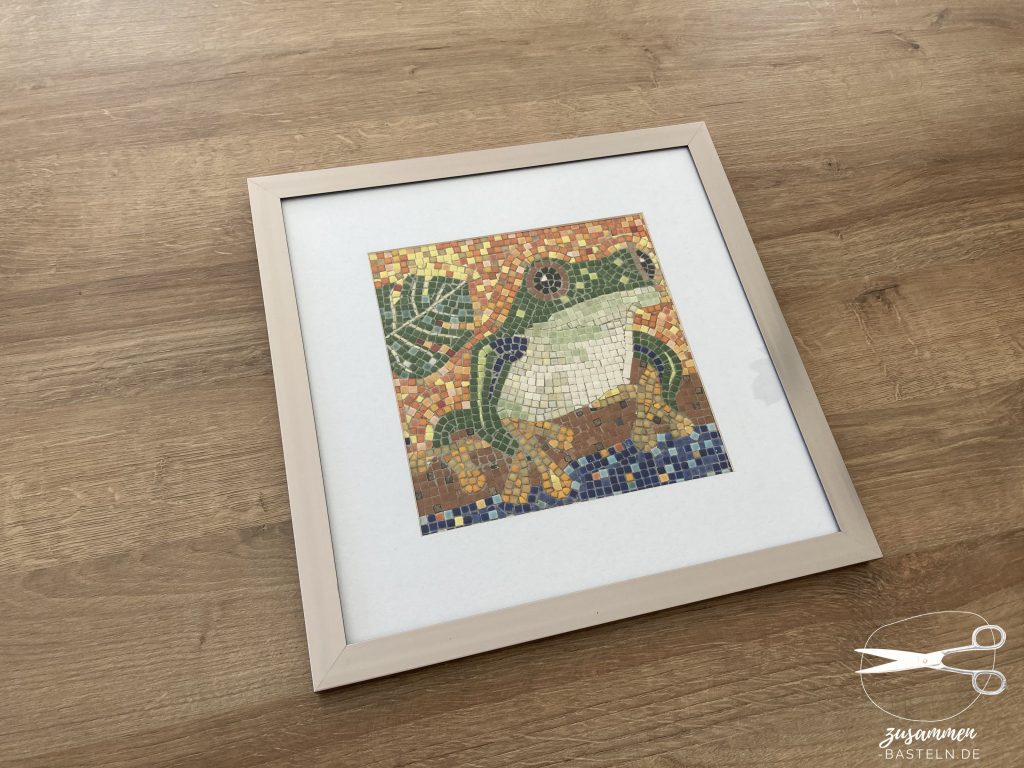 Mit der Entscheidung zu einem geeigneten Bilderrahmen habe ich mein Werk dann hinter Glas gepackt, da hätte es die Fugenmasse wohl gar nicht gebraucht. Insofern sollte man vorher überlegen, wie das Bild aufgehängt werden soll. Bilderhaken oder sonstige Aufhänger sind übrigens nicht im Set enthalten.