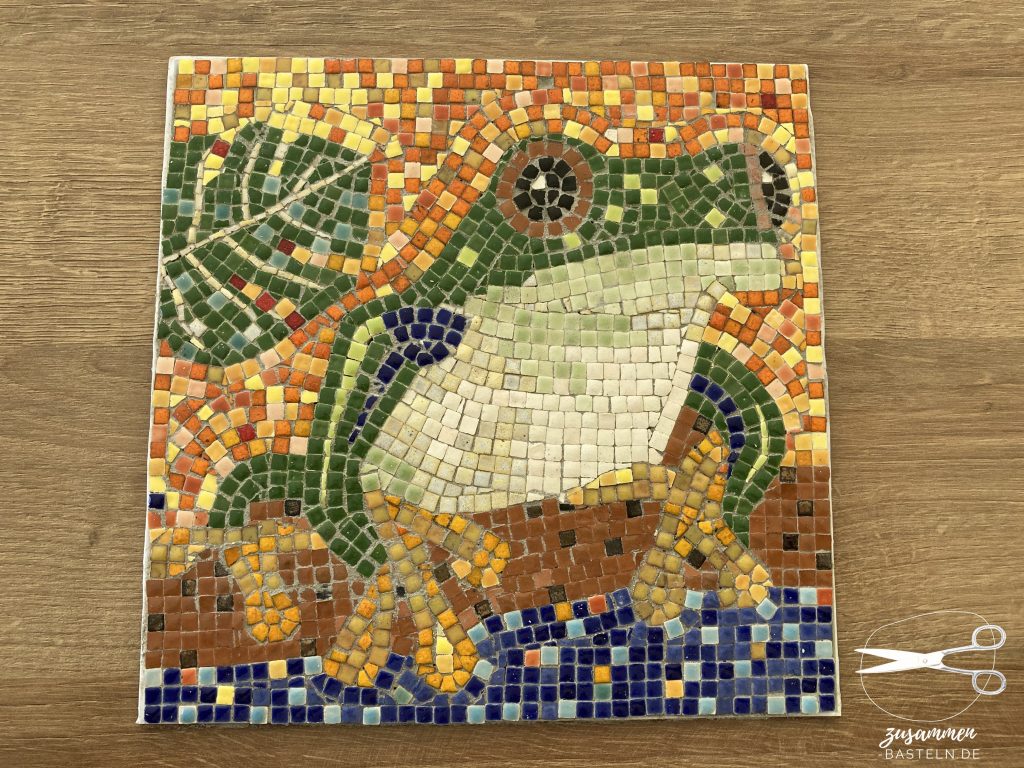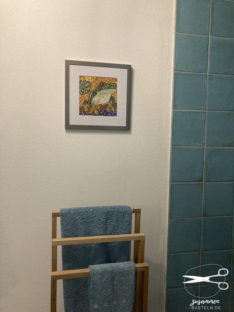 Und für mich gab es einen Mosaikfrosch in passenden Farben zu den Badezimmerfließen. Ich springe mal direkt zum Ergebnis: genial! Suchtfaktor hoch … Das fertige Bild ist etwas kleiner, als man vom Karton her vermutet, ist aber auf der Verpackung mit 20x20cm korrekt angegeben. Das Projekt braucht kaum Zubehör (Zange, Pinzette), kaum Platz und ist auch schnell zur Seite geräumt, wenn man den Esstisch belegt hat – und das Ergebnis würde glatt in einem römischen Bad durchgehen …