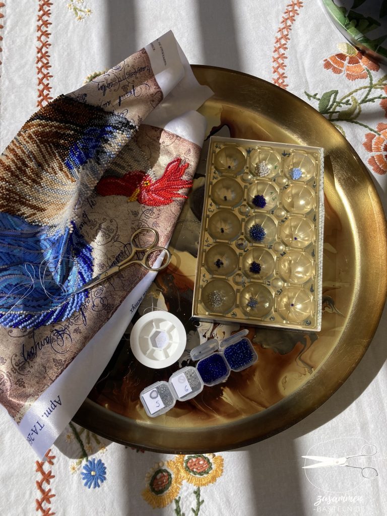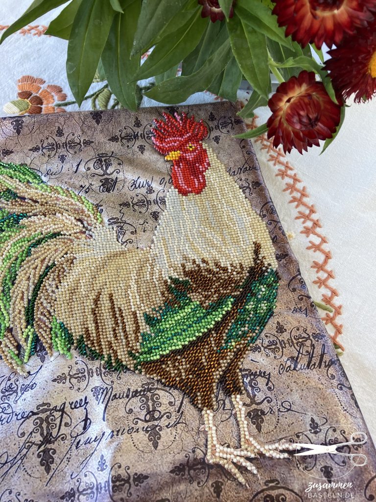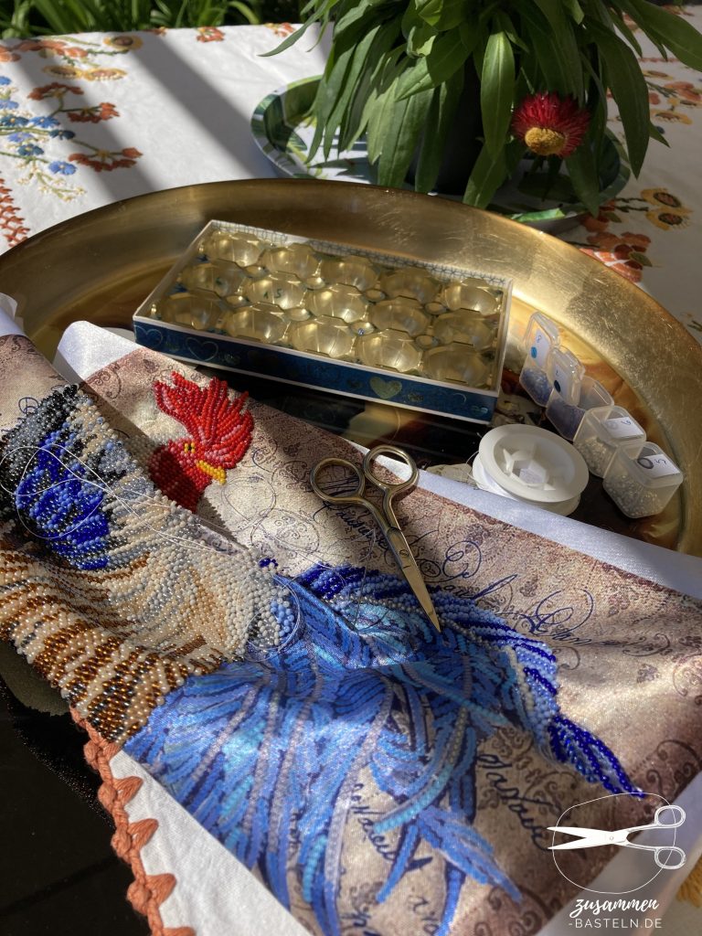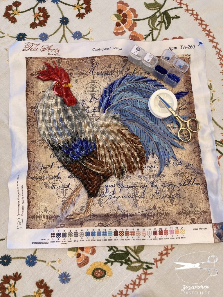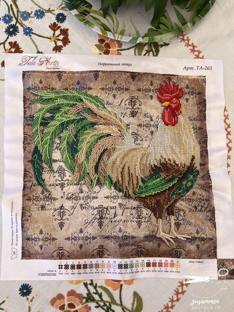 Ist es ein Zufall, oder hat die Perlenstickerei in der Ukraine eine besondere Tradition? Jedenfalls bin ich auf der Suche nach einem ganz bestimmten Motiv unter anderem auf viele wunderschöne ukrainische Beispiele gestoßen. Schließlich habe ich mich für ein – für meine Begriffe – recht teures Set entschieden: denn es sollte unbedingt ein Hahn ins Haus!