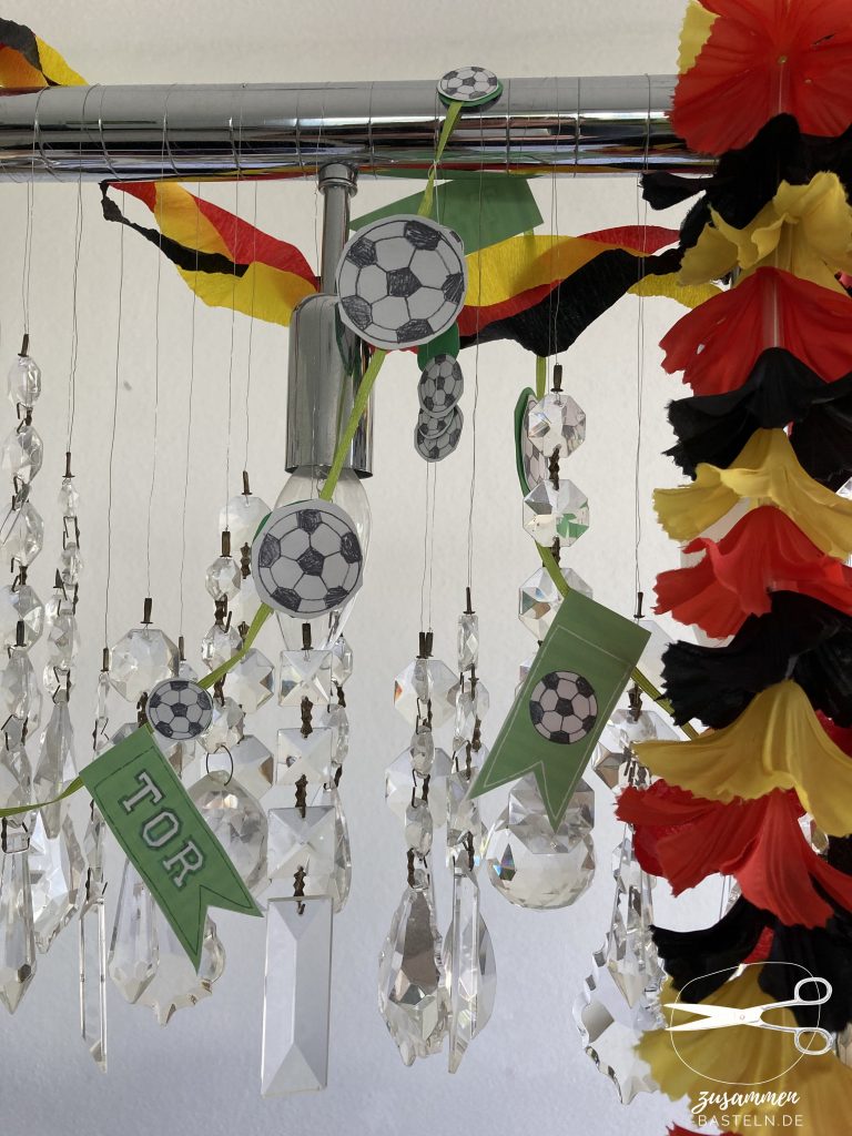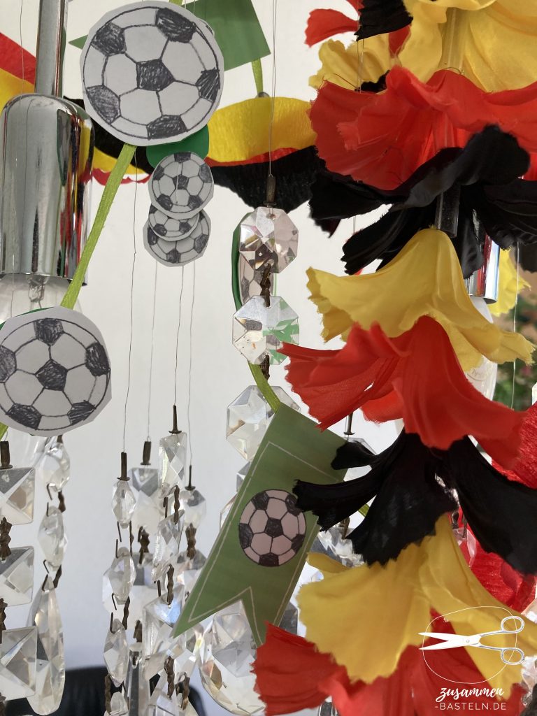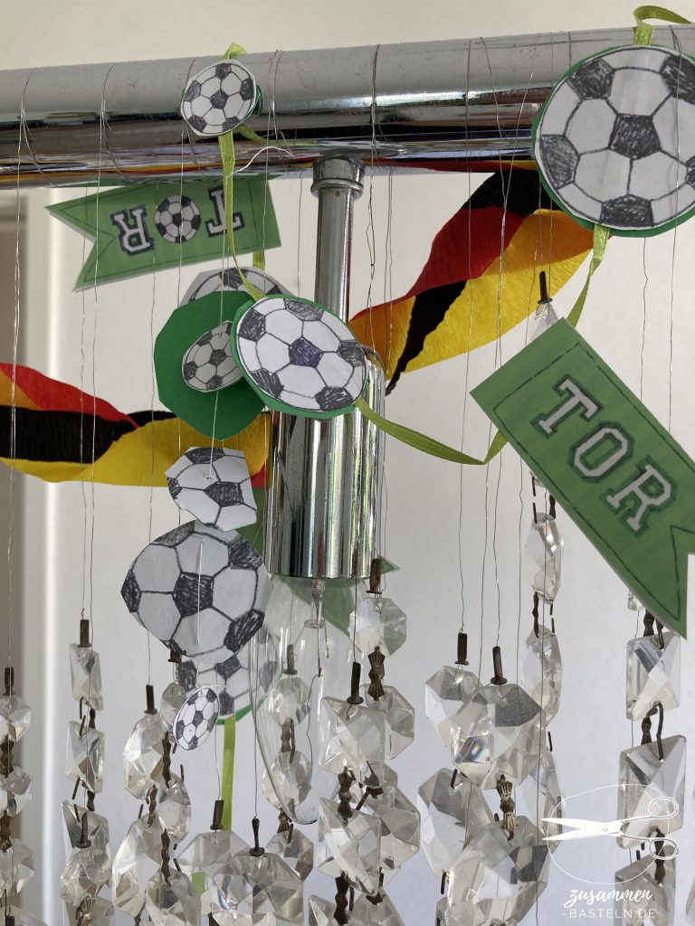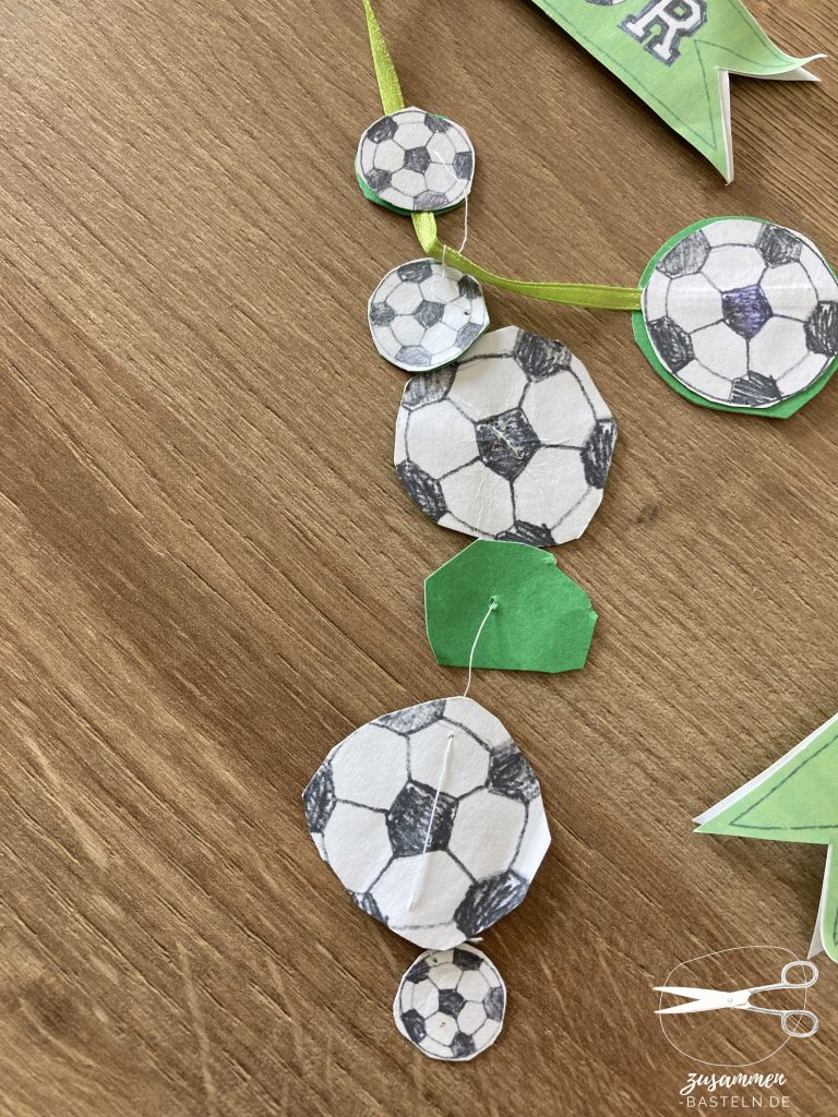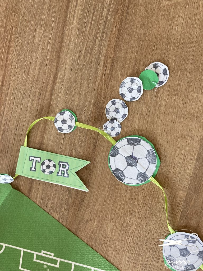 TIpp: jedes Familienmitglied bastelt eine eigene Girlande aus unterschiedlich großen Fußbällen (einfach mit Nadel und Faden auffädeln oder 2 Elemente an einem Band gegenüber-kleben). Am Schluß waren die eckigen Bälle der Kids die Schönsten 🙂