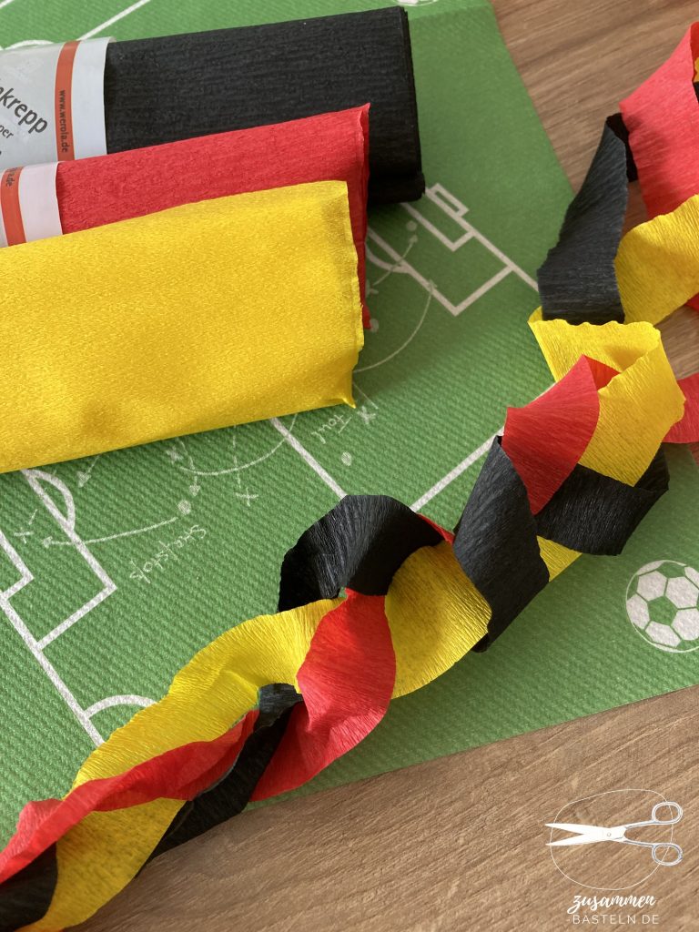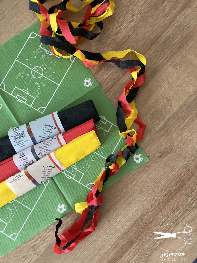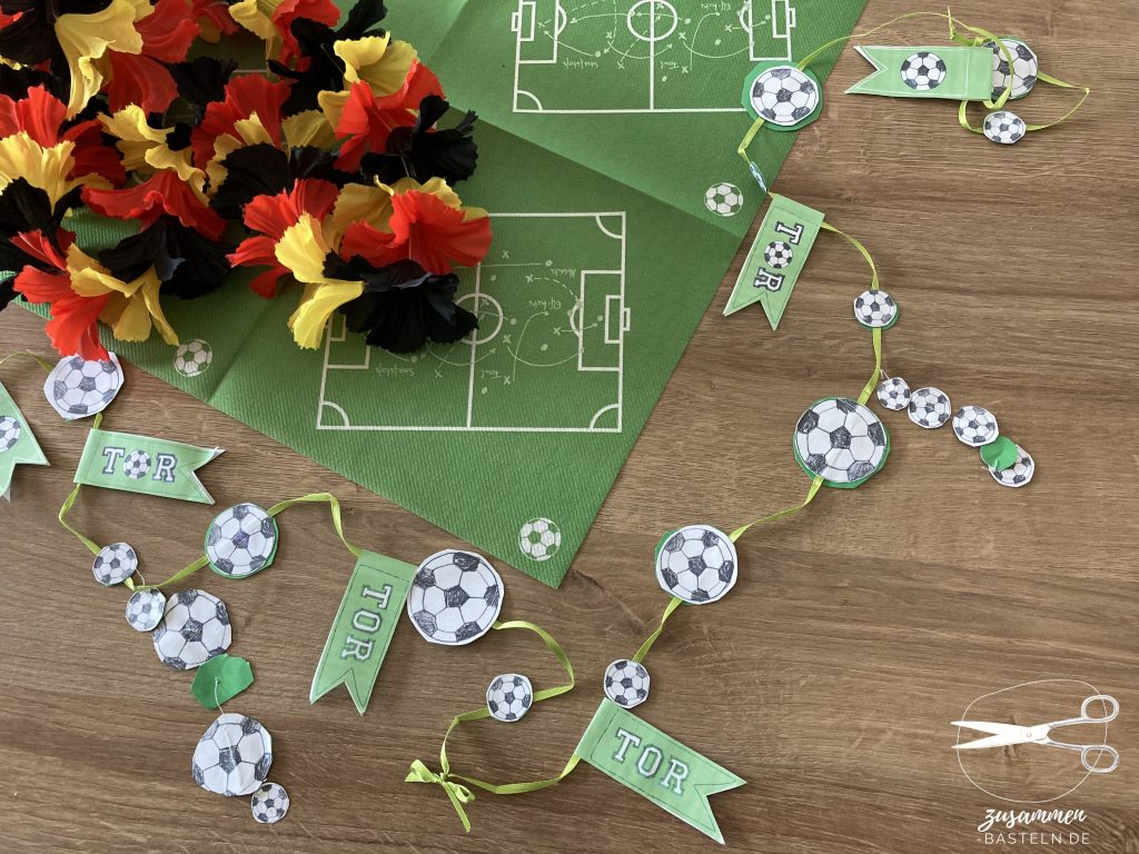 Wir haben die Vorlagen auf grasgrünen Karton geklebt und bunt gemischt als Girlande über den Tisch gehängt. Die restliche Deko wird dann jedes Mal spontan drumherum arrangiert – mit schwarzer Cola, roten Tellern und gelben Servietten stehen wir hinter unserer Mannschaft!