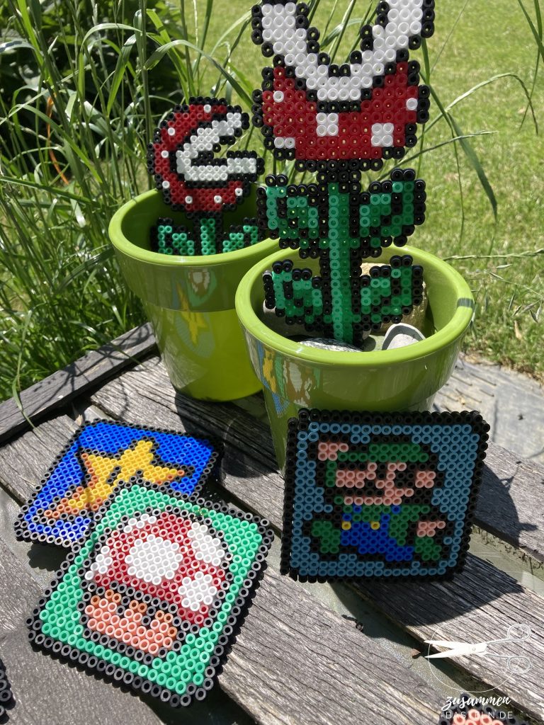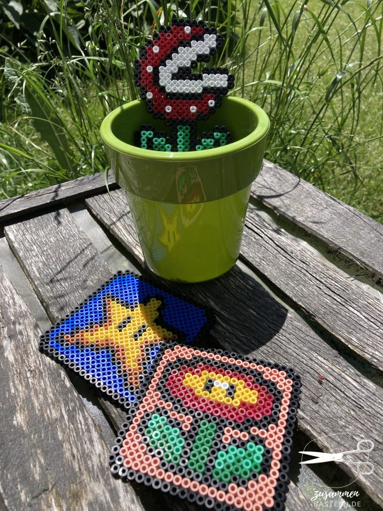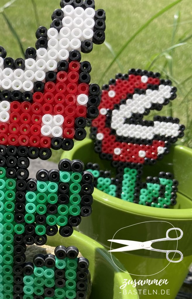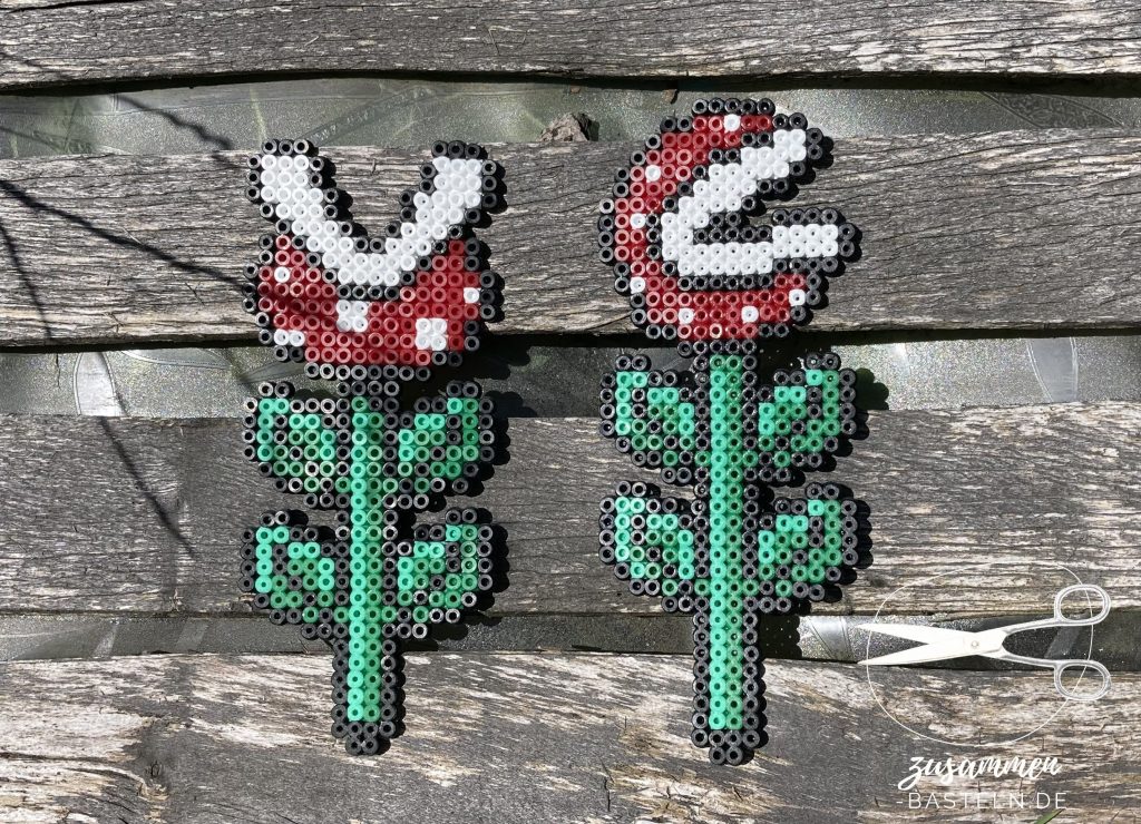 Die Bügelperlen stehen noch vom letzten Projekt bereit (hier), rot, schwarz und grün sind auch noch in großen Mengen vorhanden … perfekt für diese Geschenkidee. Denn während ich nie über das erste Level und den „doppelten Supersprung“ hinausgekommen bin, gibt es in meinem Freundeskreis ein paar echte Mario-Fans, die die fleischfressende Piranha-Pflanze aus dem „Super Mario“ Game natürlich sofort wiedererkennen.