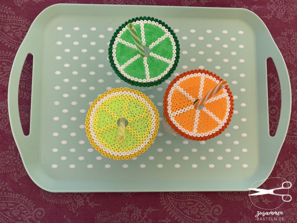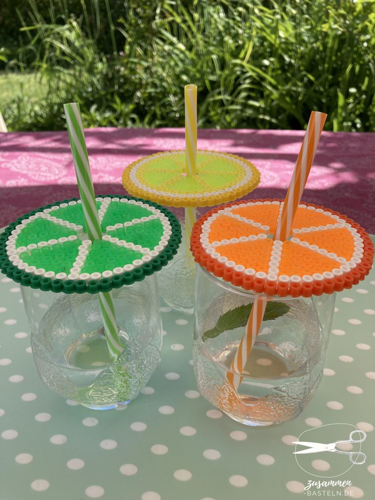 Hier bin ich auf eine tolle Idee gestoßen, wie man die Trinkbecher für Gäste markieren kann, und gleichzeitig einen kleinen Schutz vor Wespen und Insekten erhält. Auf einer runden Platte entstehen verschiedene Früchte von Zitronen, Orangen bis Kiwi und Wassermelone. Das Muster ist immer gleich, aber die Farben variieren. Dabei kann die Mitte für eine Strohhalm-Öffnung freigelassen werden.