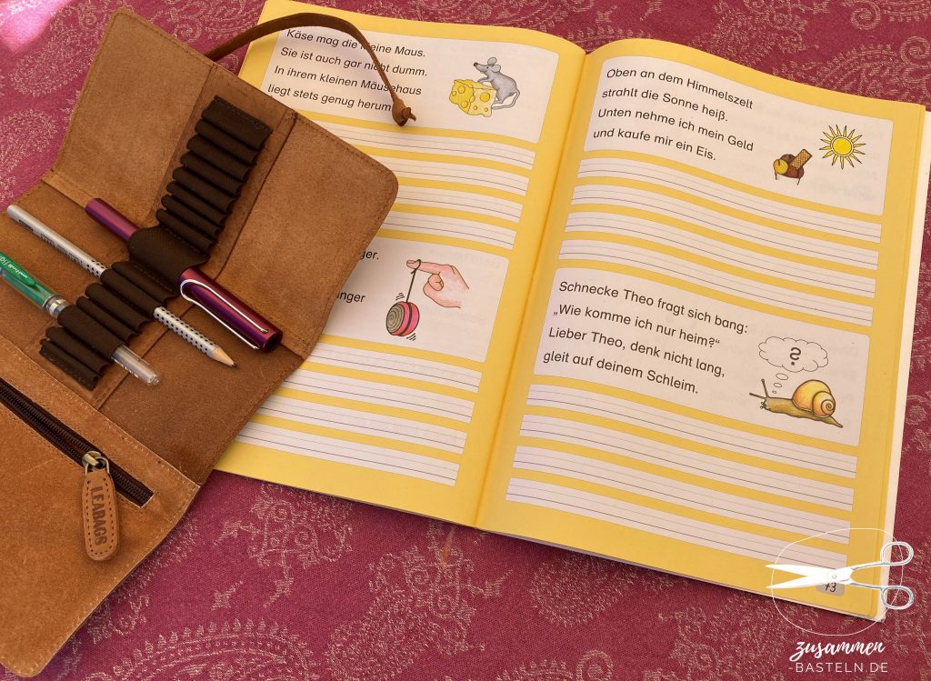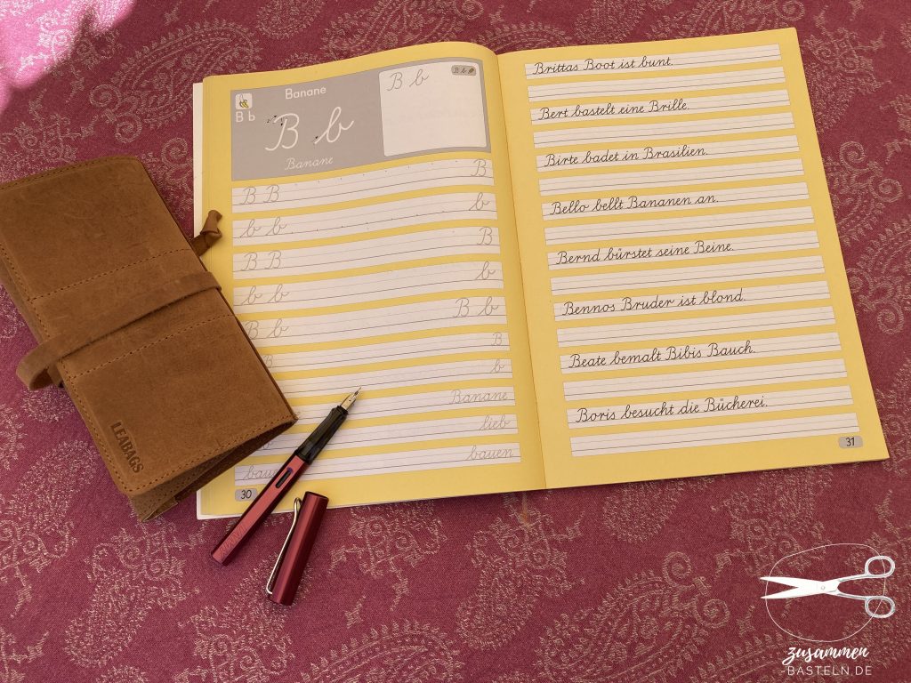 Du kannst Dir nicht vorstellen wie die Kids gestaunt haben, als Mama sich das Grundschul- Schönschriftheft gekauft und sich brav mit an die Hausaufgaben gesetzt hat! Ich schreibe sehr gerne mit Füller und habe noch die Stifte von früher. Aber dieses Projekt war ein toller Anlass, mir ein wunderschönes Modell in Pastellfarbe und das passende Ledermäppchen zuzulegen – schon habe ich mich jeden Abend gefreut, ein paar runden damit zu drehen 😉