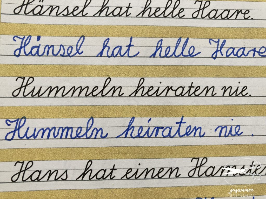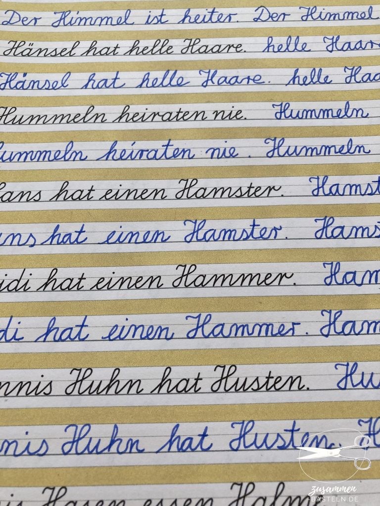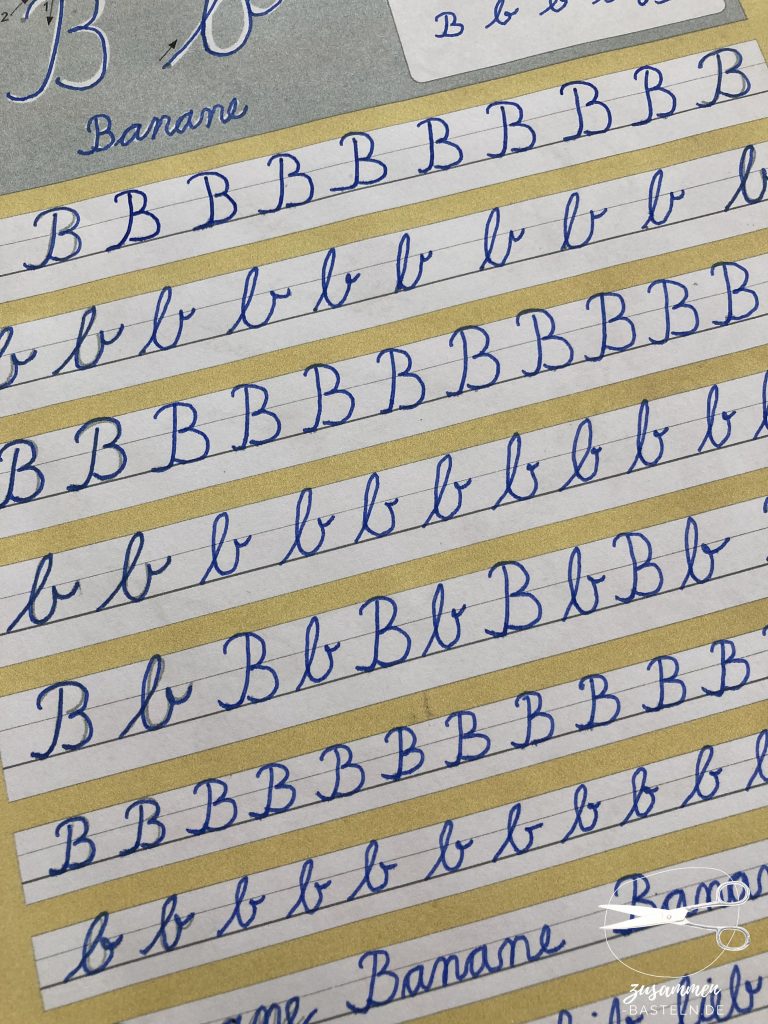 Auch hier ist das Internet natürlich voll mit Tipp, Tricks und Ideen und hat auch viele Lösungen parat, die sich direkt an Erwachsene wenden. Aber das Schreibschrift – Selbstlernheft vom jandorf Verlag ist ein Klassiker und wird quasi seit Generationen in Grundschulen eingesetzt. Insofern habe ich auf das Bewährte gesetzt: im ersten Teil übt man die einzelnen Buchstaben, später werden daraus Wörter und Sätze zusammengebaut. Meine Hand musste sich erstmal wieder ans viele Schreiben gewöhnen – damit stieg das Verständnis für das Murren der Kids. Ein „Erinnerungsvideo“ bei YouTube über die richtige Stifthaltung und ein paar Tagen Übung, und schon waren die ersten Fortschritte zu sehen!