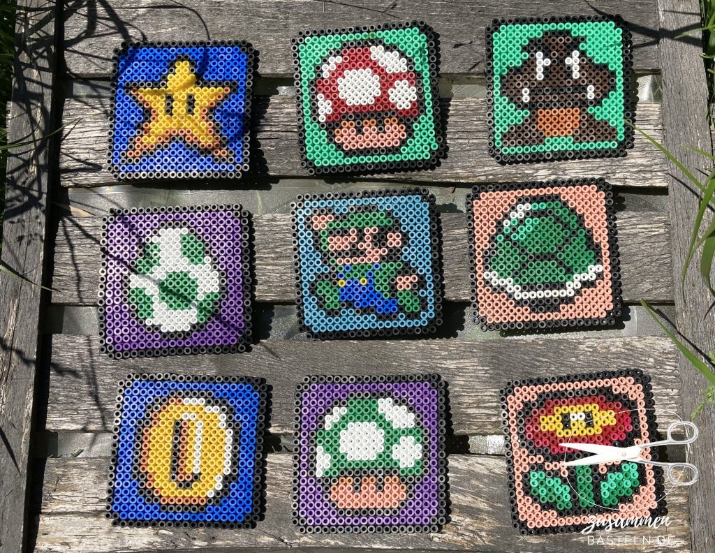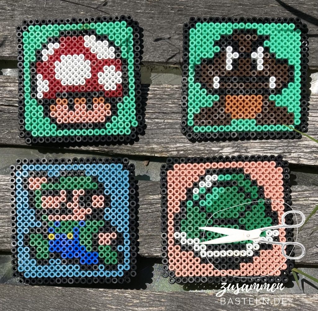 Die Vorlagen findest Du im Internet zuhauf, z.B. hier solgar als Muster für eine Stoffdecke. Ich habe mich für rechteckige Untersetzer mit schwarzem Rand entschieden – die Motive stammen aus unterschiedlichen Vorlagen und passen nun mit dem Rahmen optisch zusammen. Hier gibt auch Bilder einer passende Aufbewahrungskiste für die Untersetzer, natürlich auch aus Bügelperlen und in Form der Konsole. Dabei werden die Einzelteile als dreidimensionale Box zusammengefügt. Bei uns sind die Untersetzer aber im Dauereinsatz, die Kiste wäre immer leer und wurde somit eingespart – als Geschenk ist es aber bestimmt noch das i-Tüpfelchen.