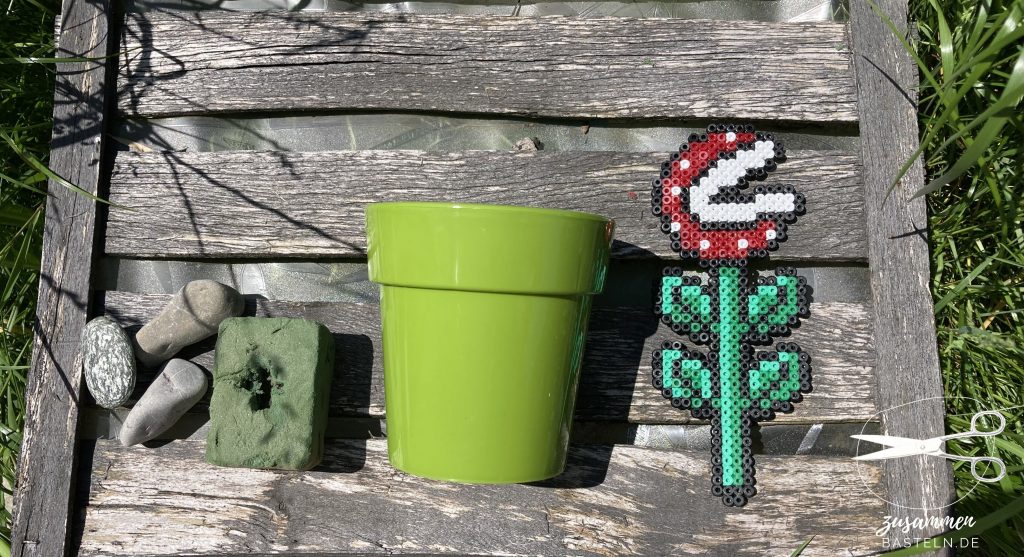 Das fertige Motiv wird dann in einen passenden grünen Blumentopf gestellt, der die grüne Röhre aus dem Spiel meiner Meinung richtig toll nachstellt. Mit etwas Steckschaum für Trockenblumen hält die Pflanze wunderbar.